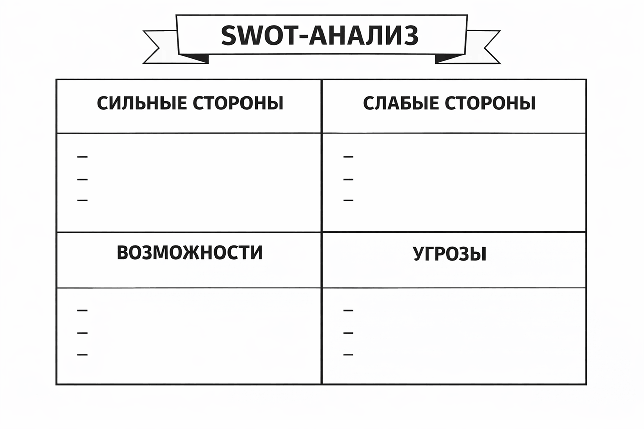 SWOT-анализ (сильные стороны, слабые стороны, возможности, угрозы) обычно применяют в бизнесе, но он отлично работает для личной рефлексии. Когда вы стоите перед важным выбором — сменить профессию, завершить отношения, начать новый проект — разберите его по четырём квадрантам. Это переводит размытые переживания в структуру и помогает увидеть картину целиком.