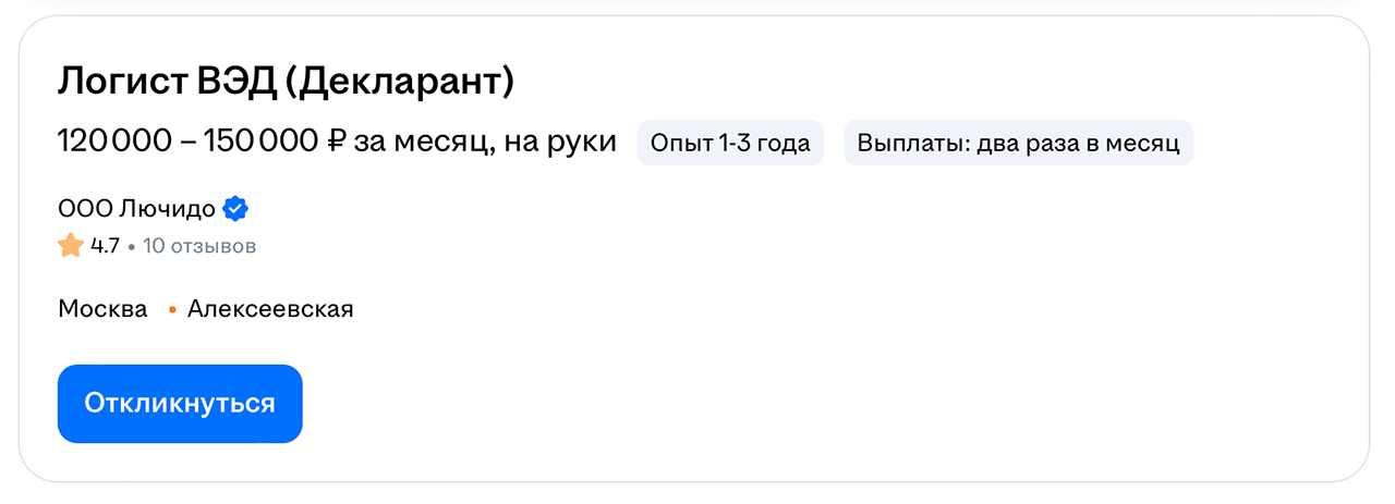 Пример вакансии для логиста внешнеэкономической деятельности (ВЭД)