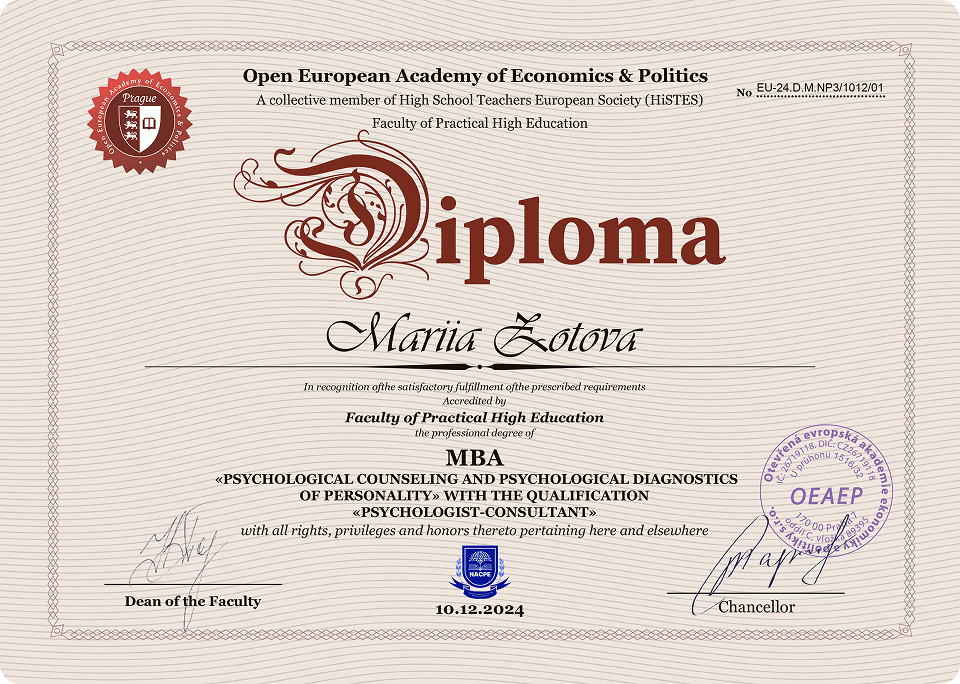 Два диплома: международный МБА от чешской академии и диплом московской академии