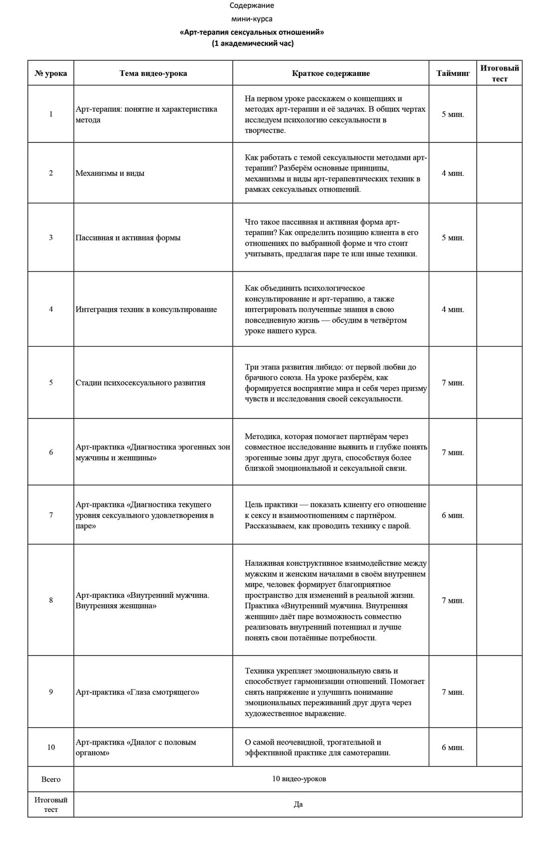 | № урока | Тема видео-урока | Краткое содержание | Тайминг | Итоговый тест | ||