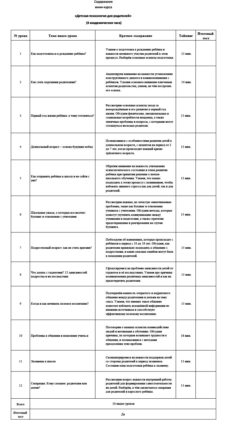 Программа курса предлагает родителям углубленное понимание эмоциональных потребностей их детей, раскрывает основы психологии развития, знакомит с эффективными методами общения и предлагает практические советы по разрешению конфликтов.