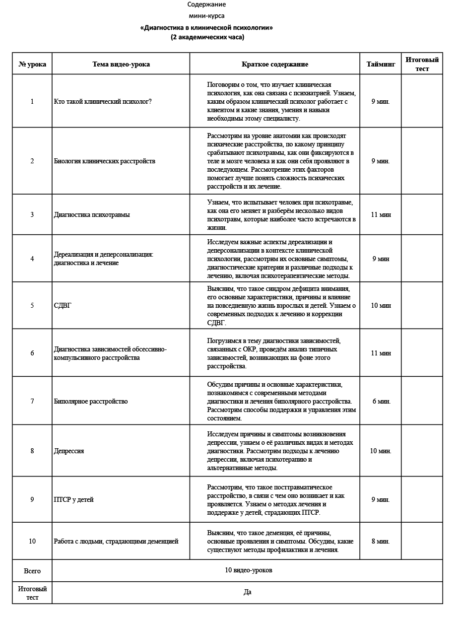 Курс сосредоточен на клинической психологии, чтобы слушатели могли проводить комплексную диагностику и коррекцию психических расстройств, а также обеспечивать психологическую поддержку клиентам с пограничными состояниями.