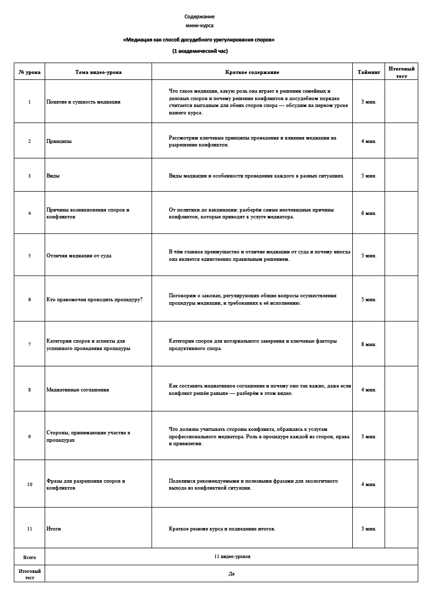 Что такое медиация, какую роль она играет в решении семейных и деловых споров и почему решение конфликтов в досудебном порядке считается выгодным для обеих сторон спора — обсудим на первом уроке нашего курса. |