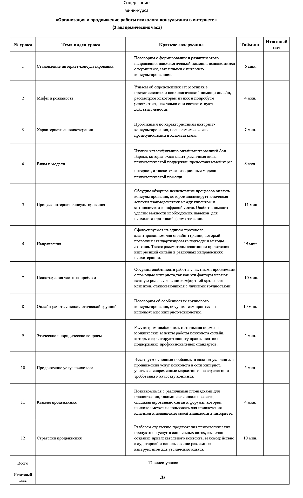 Программа курса подробно раскрывает, как войти в мир интернет-консультирования и научиться эффективно организовывать и продвигать свои услуги, освоив навыки, которые помогут вам успешно организовать свою работу в интернете и привлечь новых клиентов. Курс создан на основе современных исследований и литературы, что гарантирует актуальность и практическую ценность полученных знаний.