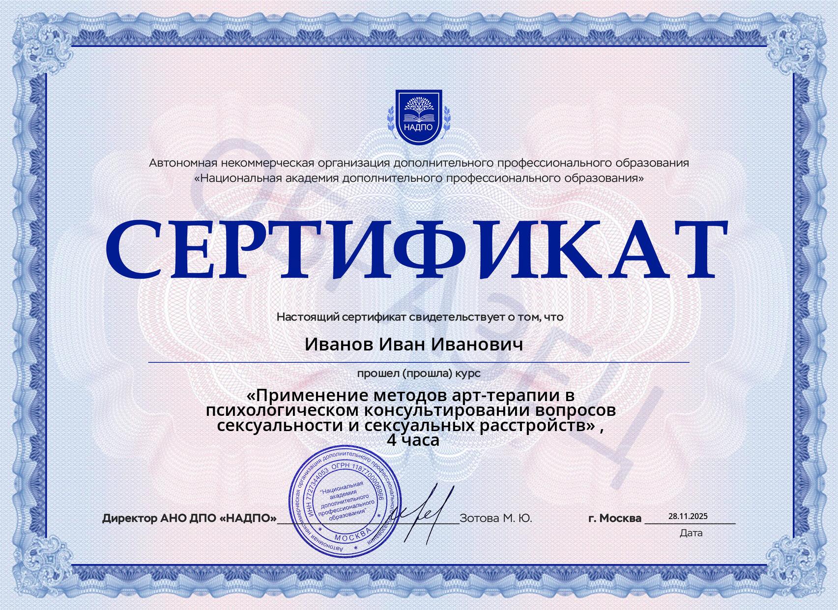Программа повышения подготовлена преподавателями-специалистами, которые готовы поделиться своими знаниями и помочь освоить не только теоретическую, но и практическую специфику курса. Для комфортного обучения из любого города Национальная академия дополнительного профессионального образования предоставляет возможность дистанционного обучения по всем направлениям переподготовки. Вы сможете проходить курсы по применению методов арт-терапии вопросов сексуальности и сексуальных расстройств в любое удобное для вас время.