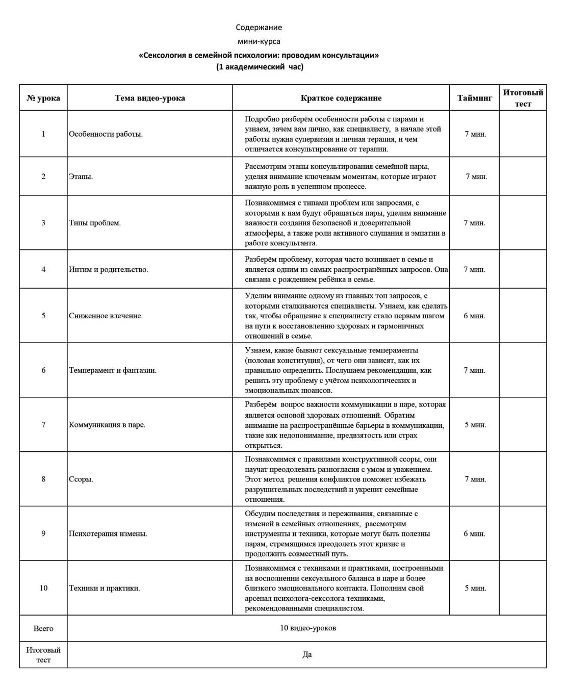 | № урока | Тема видео-урока | Краткое содержание | Тайминг | Итоговый тест | ||