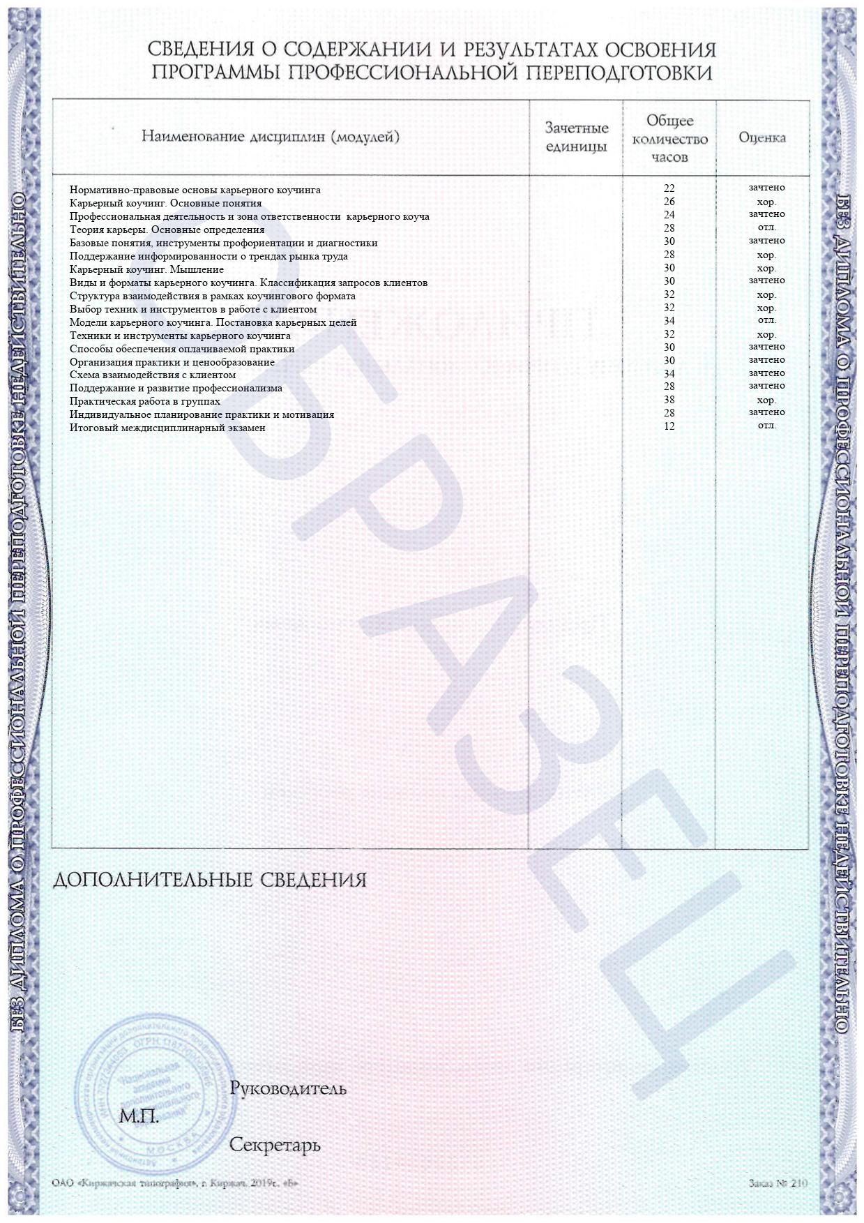 По окончании обучения выпускники получают диплом установленного образца, подтверждающий присвоение квалификации «Коуч по вопросам карьеры и профессионального развития», а также полный набор методических материалов и рабочих инструментов для начала самостоятельной практики. Программа продолжительностью 550 академических часов предназначена для действующих коучей, желающих расширить свою специализацию, HR-специалистов, психологов-консультантов и всех, кто хочет профессионально помогать людям в построении успешной карьеры.