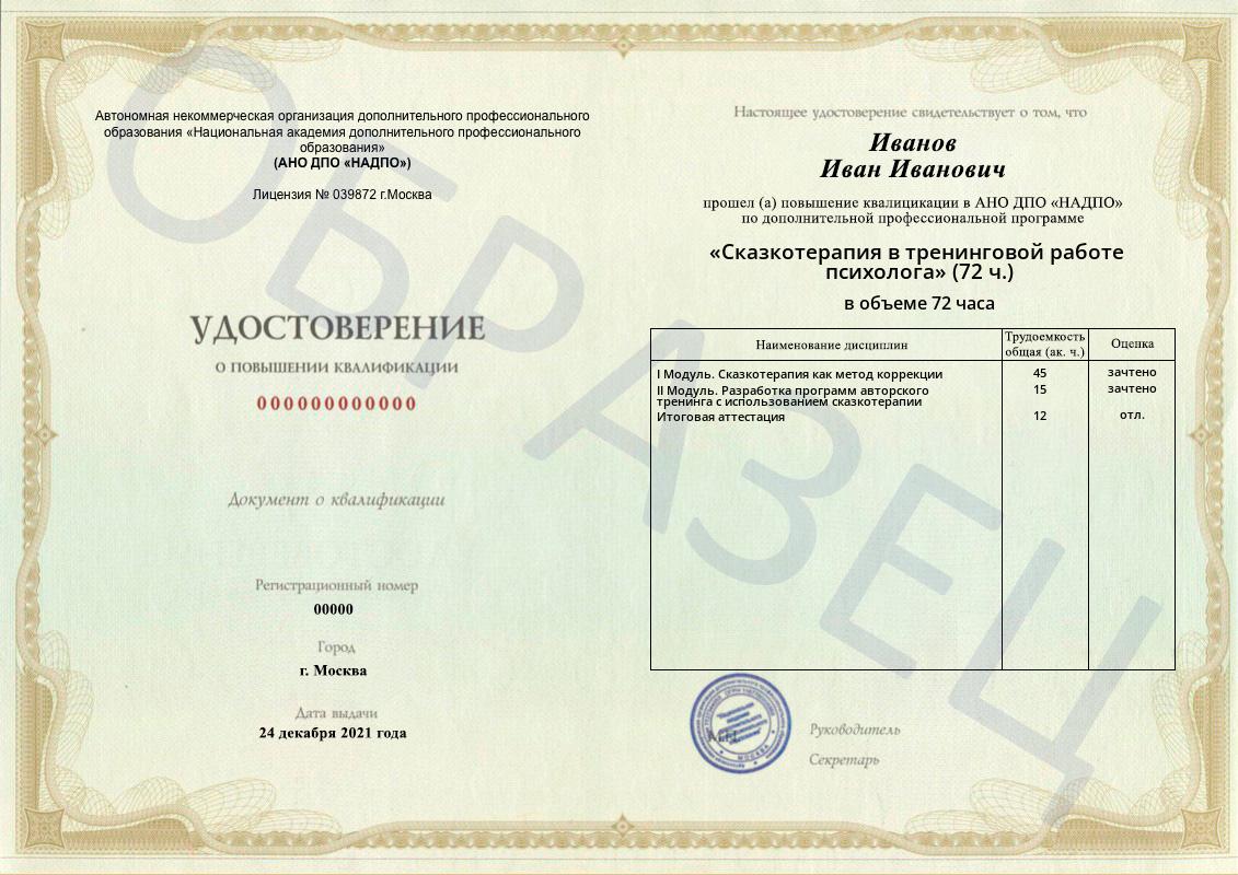 Программа повышения подготовлена преподавателями-специалистами, которые готовы поделиться своими знаниями и помочь освоить не только теоретическую, но и практическую специфику курса. Для комфортного обучения из любого города Национальная академия дополнительного профессионального образования предоставляет возможность дистанционного обучения по всем направлениям переподготовки. Вы сможете проходить курсы по сказкотерапии в тренинговой работе психолога в любое удобное для вас время.