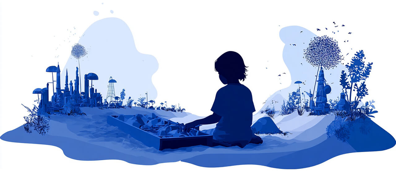 Ребёнок создаёт композиции в песочнице, используя миниатюрные фигурки (люди, животные, дома, деревья). Песок — это безопасная среда, где можно: