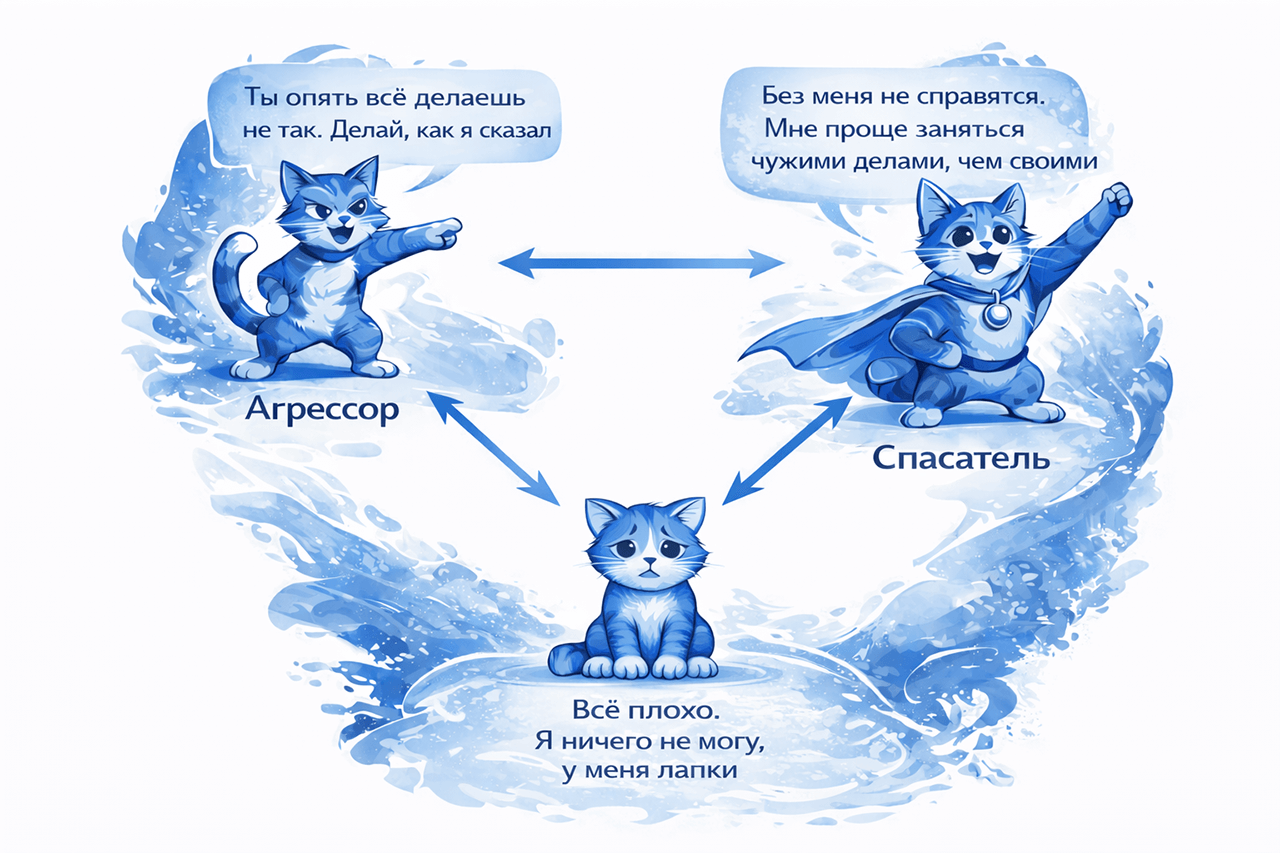 Знакомо? Многие из нас сталкиваются с такими ситуациями каждый день. Мы раздражаемся, чувствуем усталость, бессилие или даже вину, а конфликты повторяются снова и снова. На первый взгляд кажется, что это просто бытовые разногласия, но на самом деле за ними скрываются привычные эмоциональные модели и роли, в которые мы автоматически включаемся. Всё это — треугольник Карпмана.