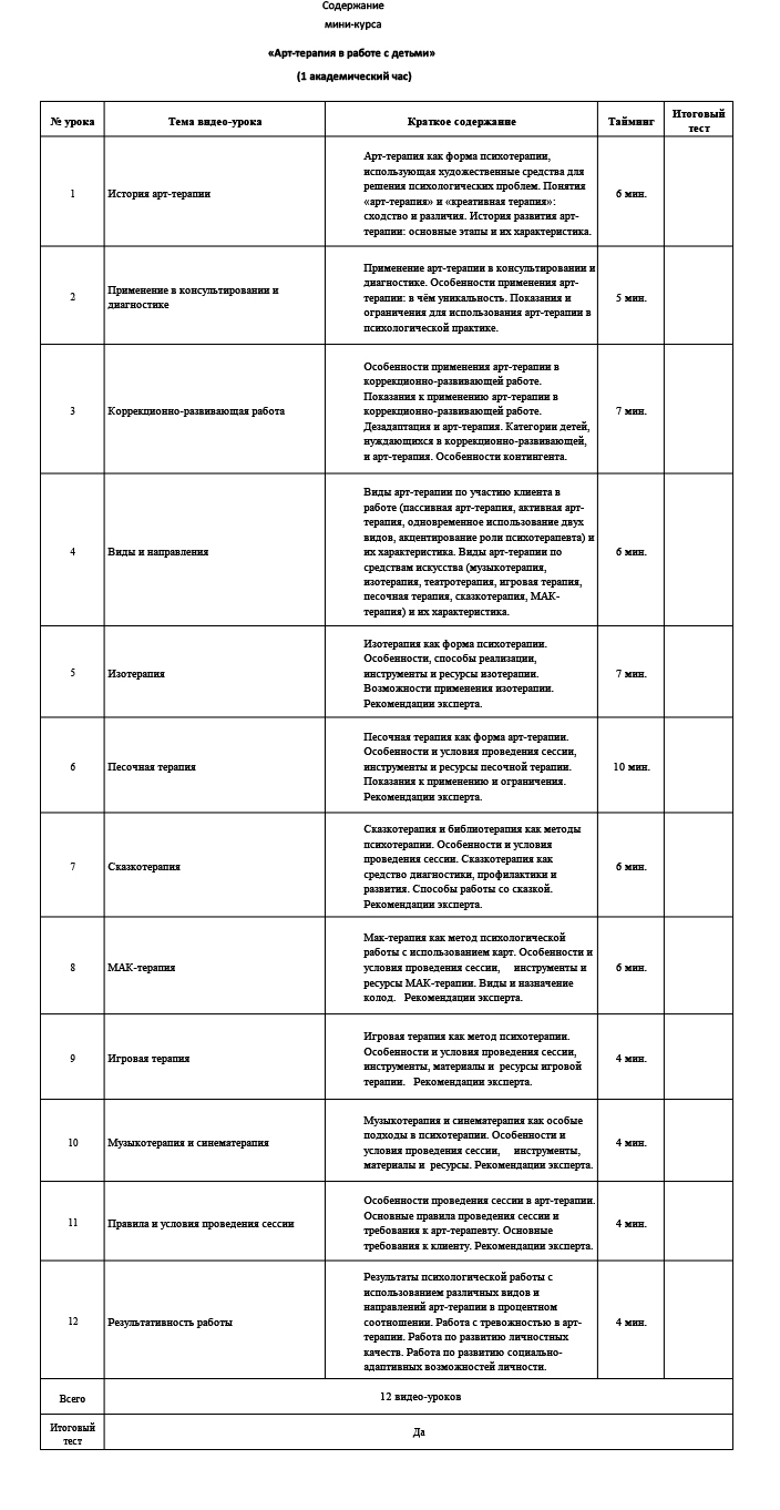 1. Мы разработали образовательную программу мини-курса «Арт-терапия в работе с детьми» таким образом, чтобы обучение проходило легко, без потери качества, и помогало начинающим специалистам-психологам уверенно сделать первые шаги в профессиональной деятельности. Курс сжатый, но насыщенный ключевыми знаниями и техниками, которые можно сразу применять на практике, что позволяет совмещать обучение с работой или другими обязательствами.