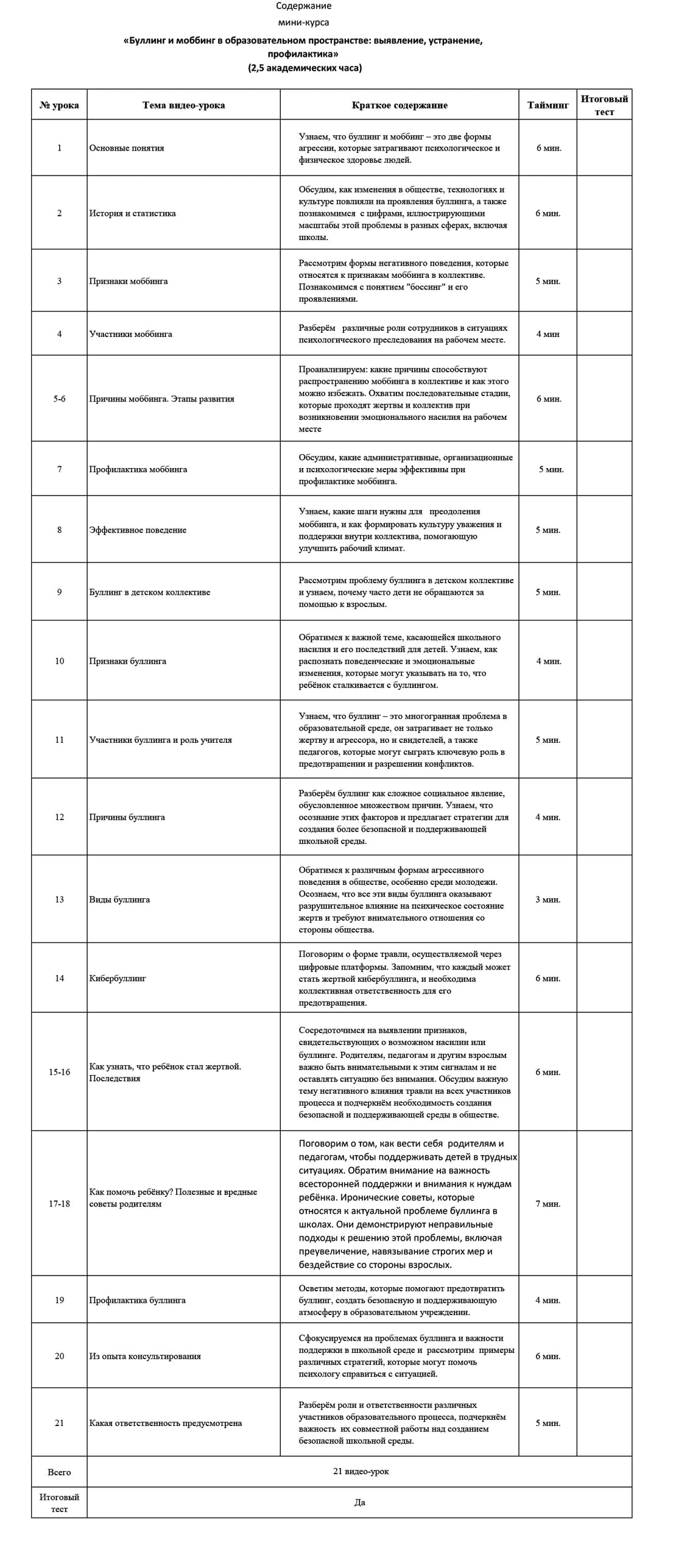 Программа курса познакомит с понятиями «буллинг» и «моббинг», их причинами, видами, признаками и эффективными способами поведения. Прозвучат ответы на вопросы: как помочь жертвам травли? какие меры профилактики могут быть предприняты? как искать решение проблемы буллинга? Как создавать безопасную образовательную среду для всех?