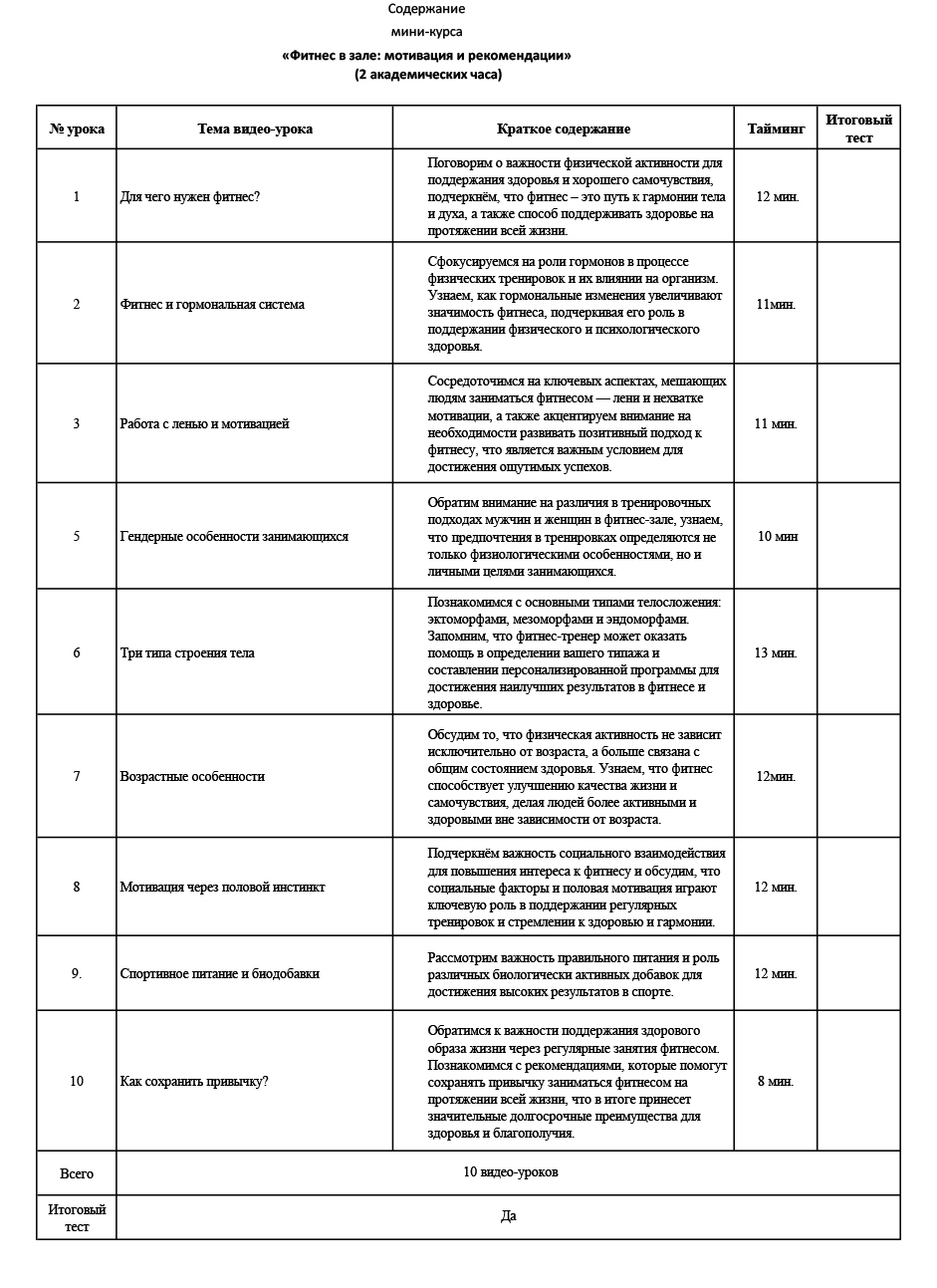 Особое внимание в программе уделяется практическим аспектам формирования устойчивой мотивации к занятиям фитнесом, пониманию гормональных механизмов, влияющих на физическую активность, и развитию навыков самодисциплины.