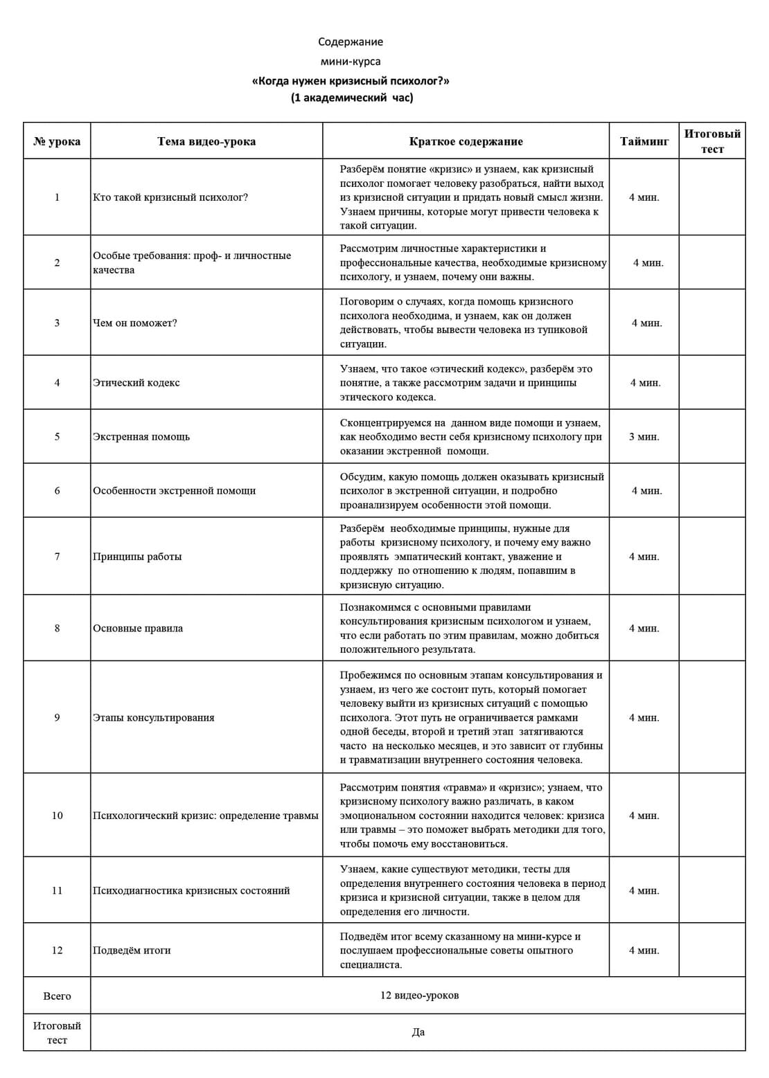 | № урока | Тема видео-урока | Краткое содержание | Тайминг | Итоговый тест | ||