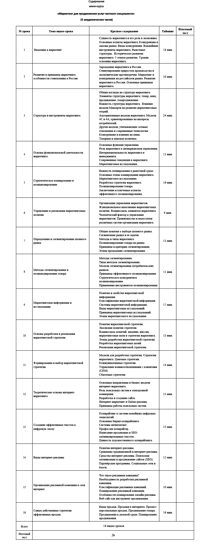 1. Мы разработали образовательную программу мини-курса «Маркетинг для продвижения услуг частного специалиста» таким образом, чтобы обучение проходило легко, без потери качества, и помогало начинающим специалистам-психологам уверенно сделать первые шаги в профессиональной деятельности. Курс сжатый, но насыщенный ключевыми знаниями и техниками, которые можно сразу применять на практике, что позволяет совмещать обучение с работой или другими обязательствами.