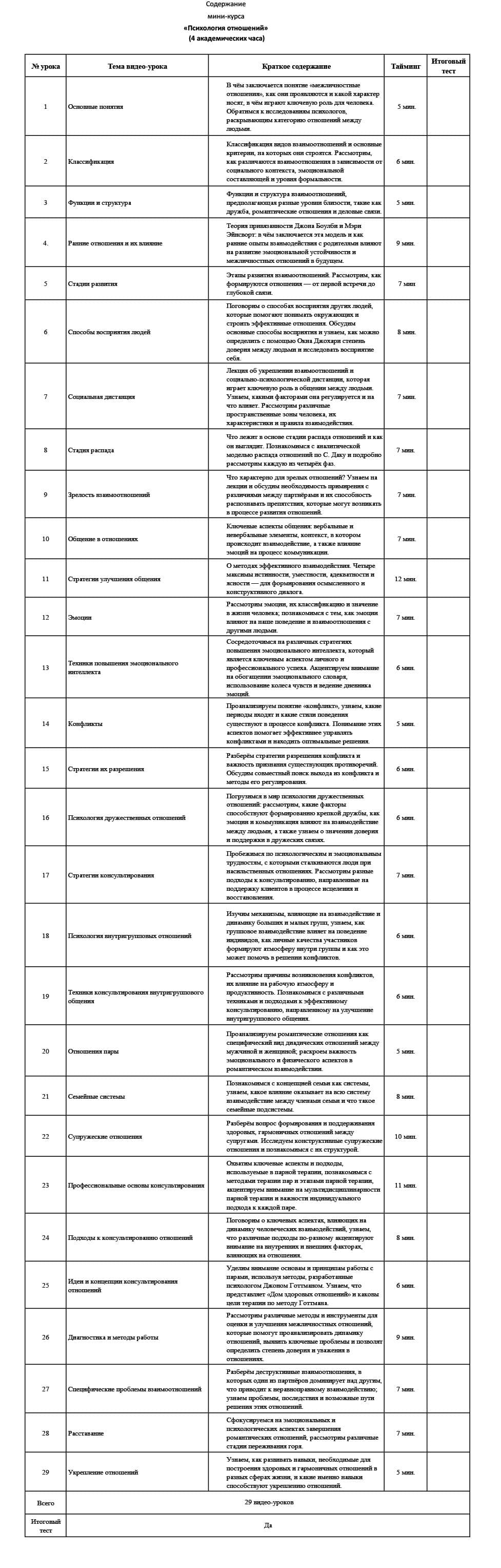 | № урока | Тема видео-урока | Краткое содержание | Тайминг | Итоговый тест | ||