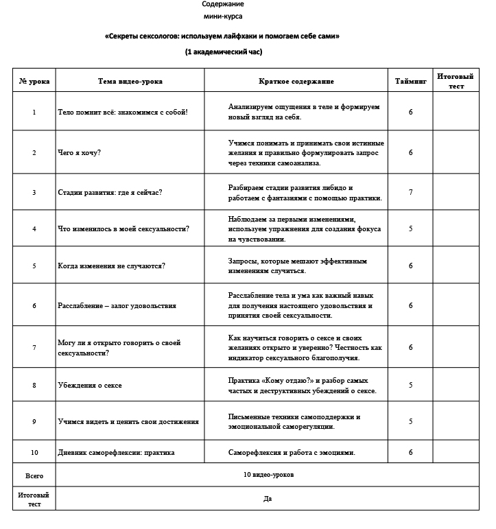 Мы разработали программу курса «Секреты сексологов: используем лайфхаки и помогаем себе сами» таким образом, чтобы обучение давалось вам легко и без потери качества. Как проходит обучение?