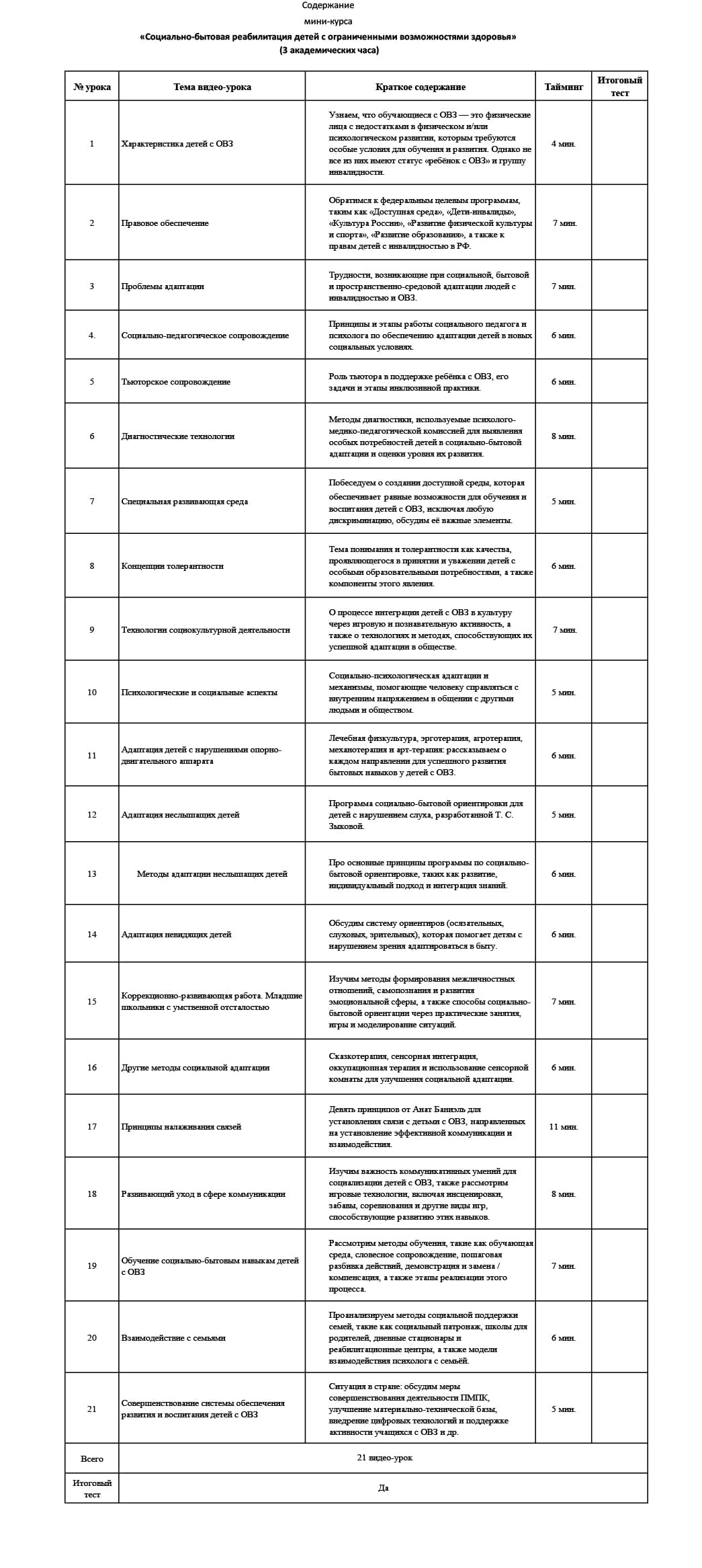 | № урока | Тема видео-урока | Краткое содержание | Тайминг | Итоговый тест | ||