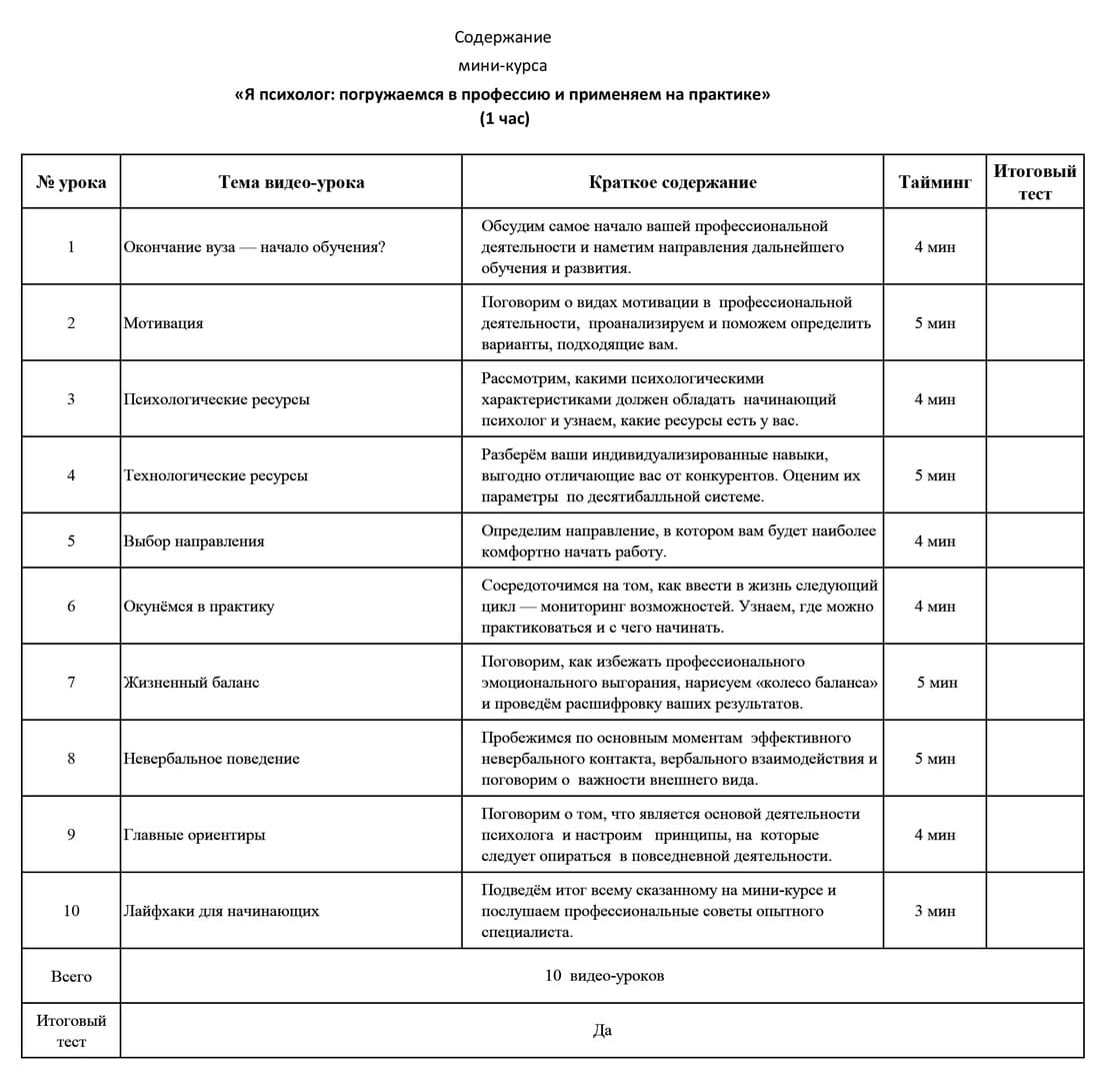 | № урока | Тема видео-урока | Краткое содержание | Тайминг | Итоговый тест | ||